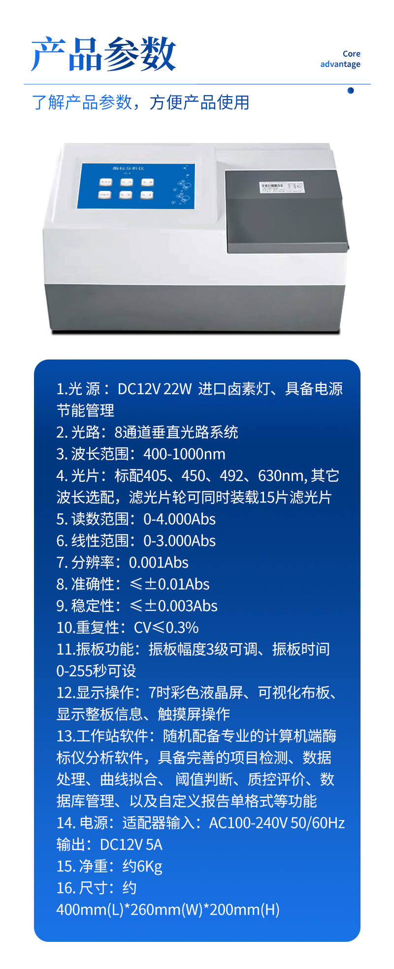 5. 讀數范圍:0-4.000Abs