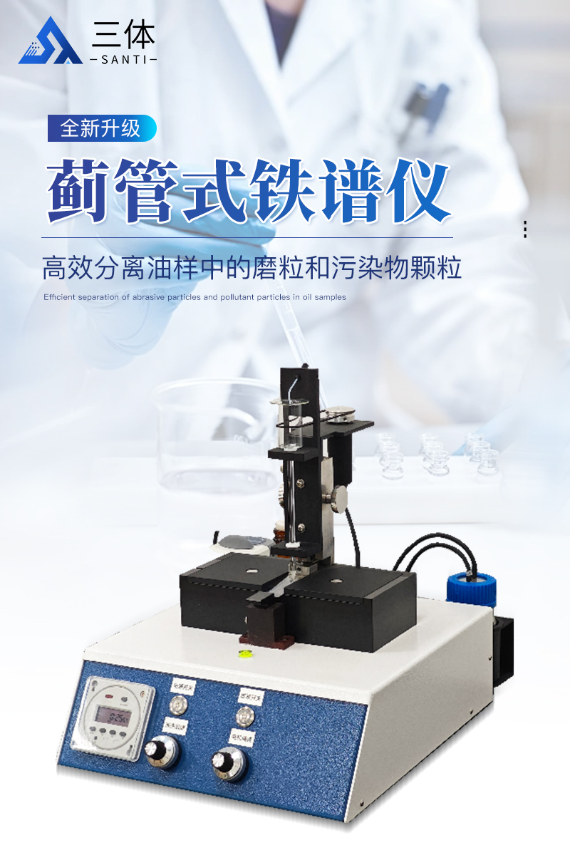 薊管式鐵譜儀是一套完整的鐵譜分析系統,用以分離和評定在用潤滑油、液壓油、冷卻液或燃油中的磨損顆粒和污染物顆粒,由薊管式鐵譜儀、顯微鏡、工業攝像頭、加熱盤(可選)和圖像采集軟件組成。為了確保譜片的制作質量,經稀釋處理后的被測油液在自身重力作用下直接通過薊型管,勻速流過鐵譜譜片,油液中鐵磁性顆粒在磁場作用下被沉積到譜片上,有效避免了制譜過程中外界作用力對磨粒造成的破損、變形等傷害;通過控制清洗劑的流量和流速,對譜片進行徹底沖洗;譜片干燥后進行分析。將制備好的譜片平穩的放在顯微鏡的載樣臺,通過使用顯微鏡的透射光、反射光、偏振光、紅綠光源以及譜片加熱等分析手段,參照標準的磨粒圖譜,對磨損顆粒進行深入分析。