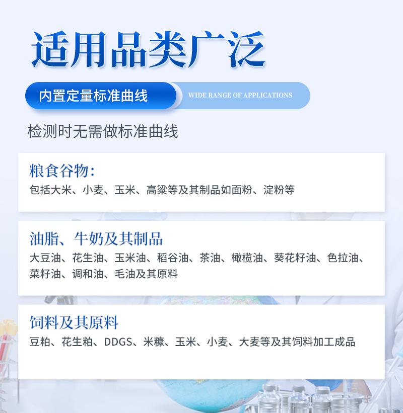 4、內(nèi)置定量標(biāo)準(zhǔn)曲線:儀器內(nèi)置標(biāo)準(zhǔn)曲線,無需使用標(biāo)準(zhǔn)品,檢測時(shí)無需做標(biāo)準(zhǔn)曲線,既節(jié)省了成本,也避免了操作人員與嘔吐毒素的接觸,保護(hù)操作人員的安全;