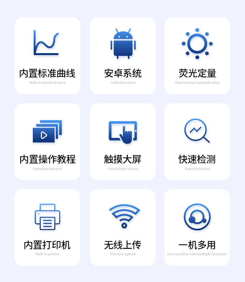 2、穩(wěn)定性**:采用進(jìn)口熒光微球,顆粒均一,從源頭保證產(chǎn)品穩(wěn)定性好,批次內(nèi)、批次間重現(xiàn)性好;配備8孔恒溫孵育器,一條一孔,自動計(jì)時(shí),蜂鳴提醒,不受外界溫濕度影響,適用場地更廣;